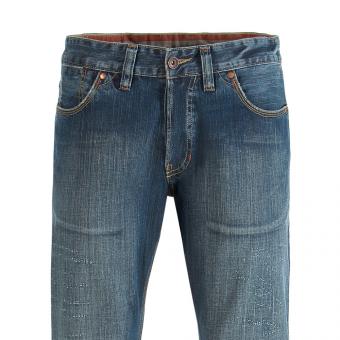 Die modische und schmale Herrenjeans von Kuyichi. Schmale Low Boot Jeans mit geradem Beinschnitt. Gefertigt ist die Jeans aus 16/23 Rusty Denim in dunkler Waschung mit markant starkem Abrieb und aufwändig, von Hand gearbeiteten Used-Effekten.